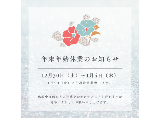 2023/12/22こんにちは矢木です! 今年も残り僅かになりましたね! 年末年始の営業のお知らせです(^▽^)/ 12月29日10:30~17時(最終受付15時半) 12月30日~1月4日まで休... -